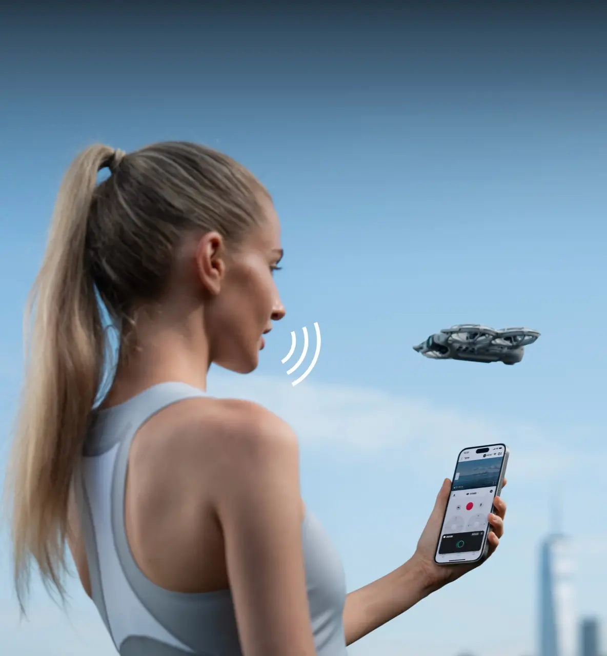You can send flying commands using your smartphone or Bluetooth earphones with complete freedom, whether on a run or cycling. When connected to your phone, it can capture audio and intelligently reduce noise, automatically filtering out propeller noise.